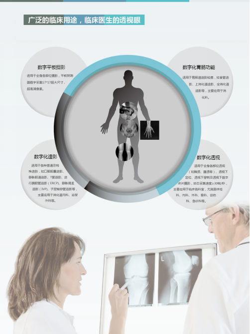 一、數(shù)字平板攝影:真正的動態(tài)DR采用平板探測器成像,可替代平板DR進(jìn)行數(shù)字?jǐn)z影,獲得高度千萬像素的大尺寸(通常是17"*17"或14"*17")影像。